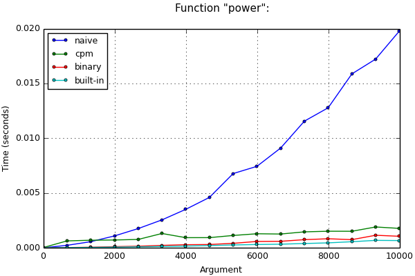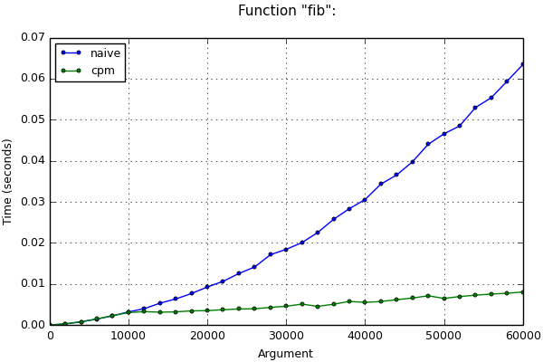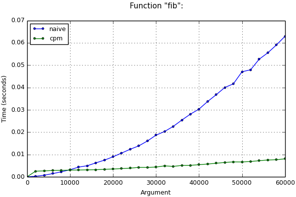If we do use arbitrary-precision arithmetic, time estimations can be wrong. For example, when computing the nth Fibonacci number, variable values will become greater from iteration to iteration. Thus, operations containing them will slow down. It’s more complicated to execute the asymptotical estimation of the program execution time. We would have to take into account the length of numbers in variables during each iteration, as well as used methods of number multiplications. Therefore, we are not going to review it here. Nevertheless, after applying this method of optimization, asymptotics worsens even in this case. You can see it on the chart below: